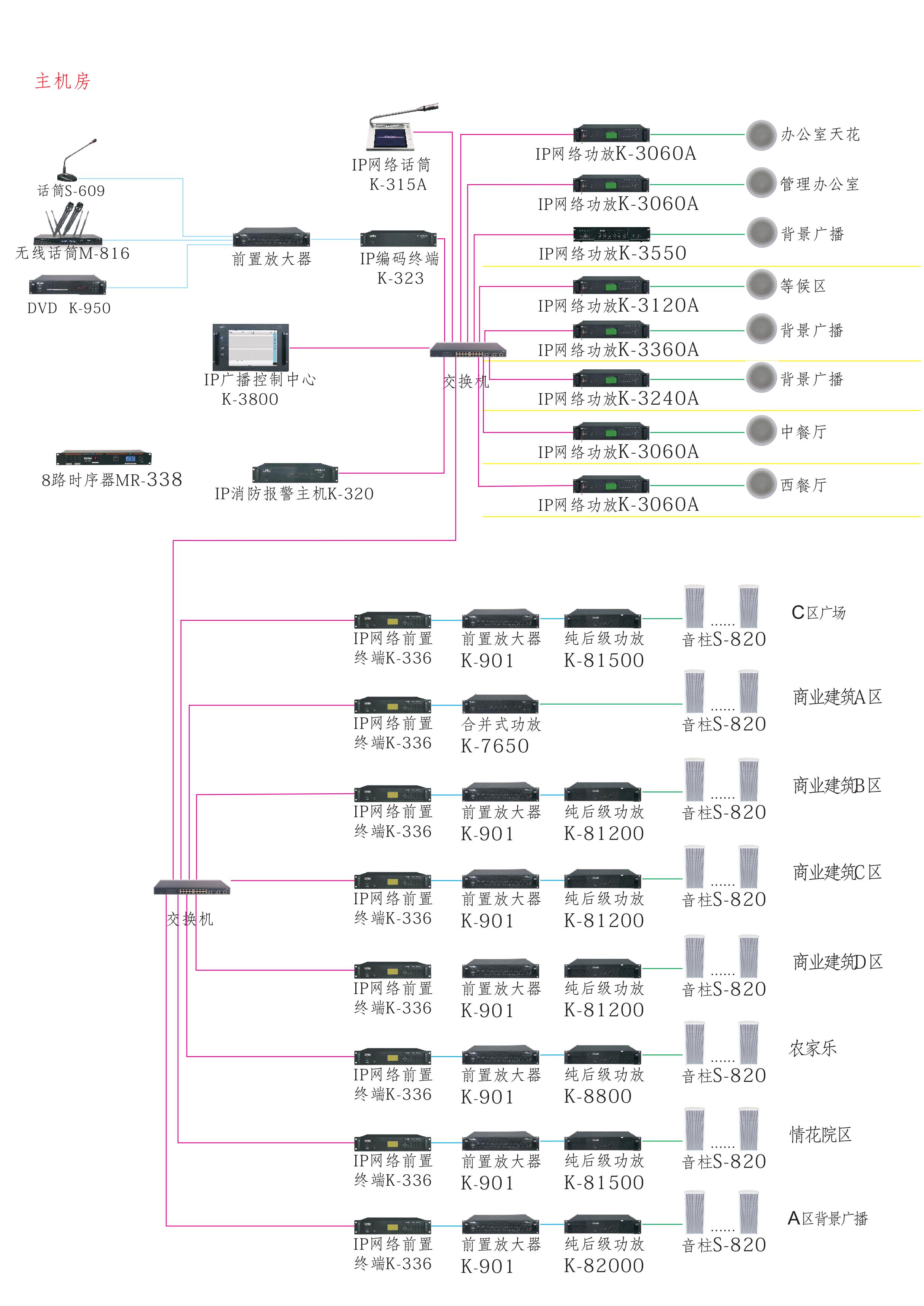 1.大型商業(yè)綜合體廣播系統(tǒng)共用計(jì)算機(jī)網(wǎng)絡(luò)或布設(shè)廣播專用網(wǎng)絡(luò),音源輸入使用8分區(qū)的IP網(wǎng)絡(luò)輸入單元,可提供多達(dá)8路高質(zhì)量音樂廣播音源,用于酒店、大型商場(chǎng)、寫字樓、停車場(chǎng)的信息發(fā)布及背景音樂播放,也可為寫字樓提供上下班定時(shí)打鈴功能;