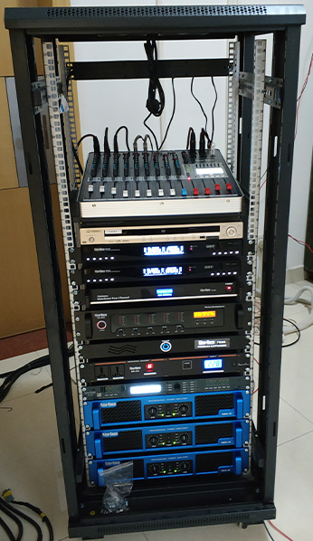 專業擴聲系統簡單來說就是把聲音信號放大,主要由聲源、音頻處理設備、功放及揚聲器系統組成。通過計算會議室的音響場地系數進行設計,保證會議室每個角落的聲場聽覺均勻,音響效果達到語言清晰、無失真、聲場分布均勻。